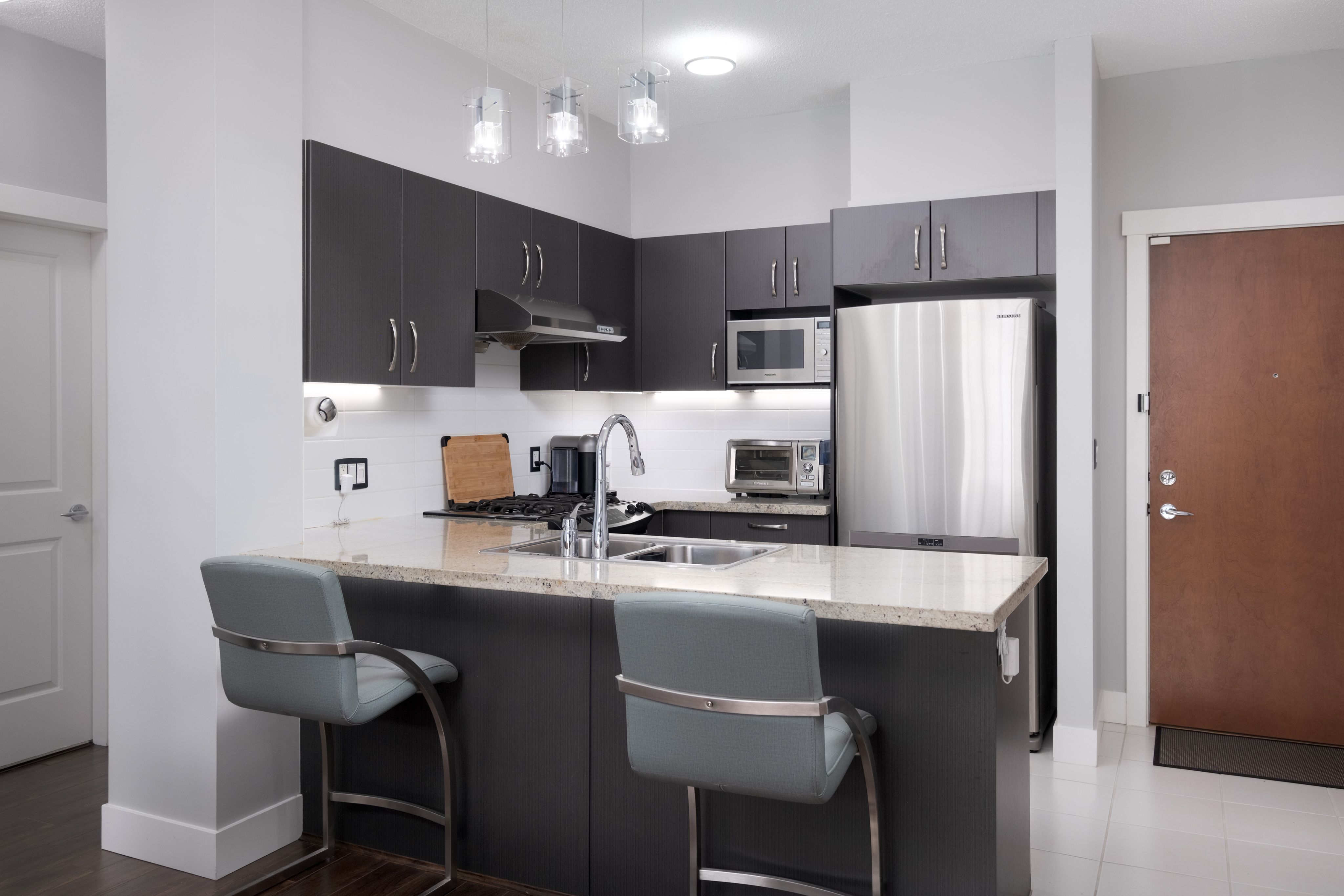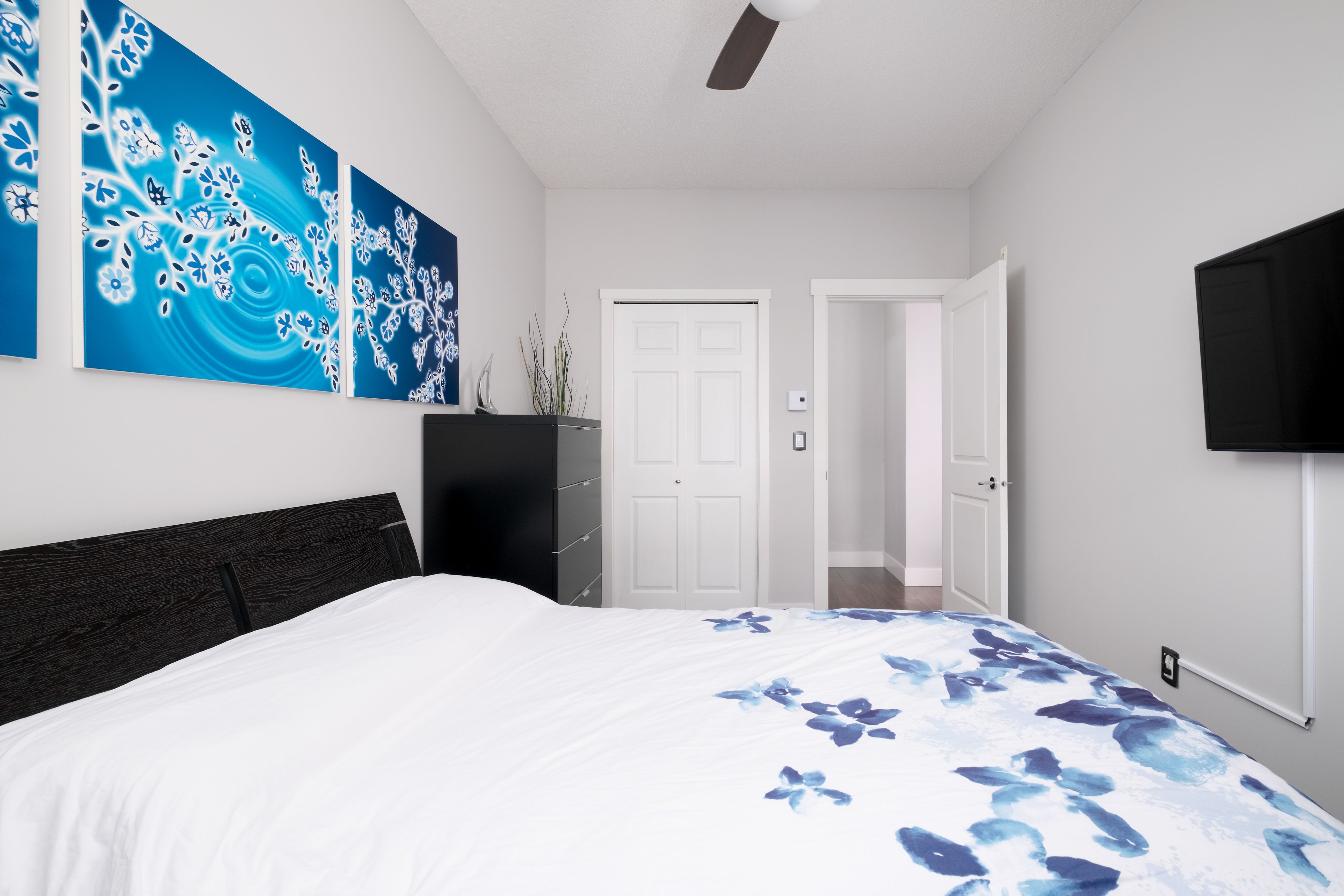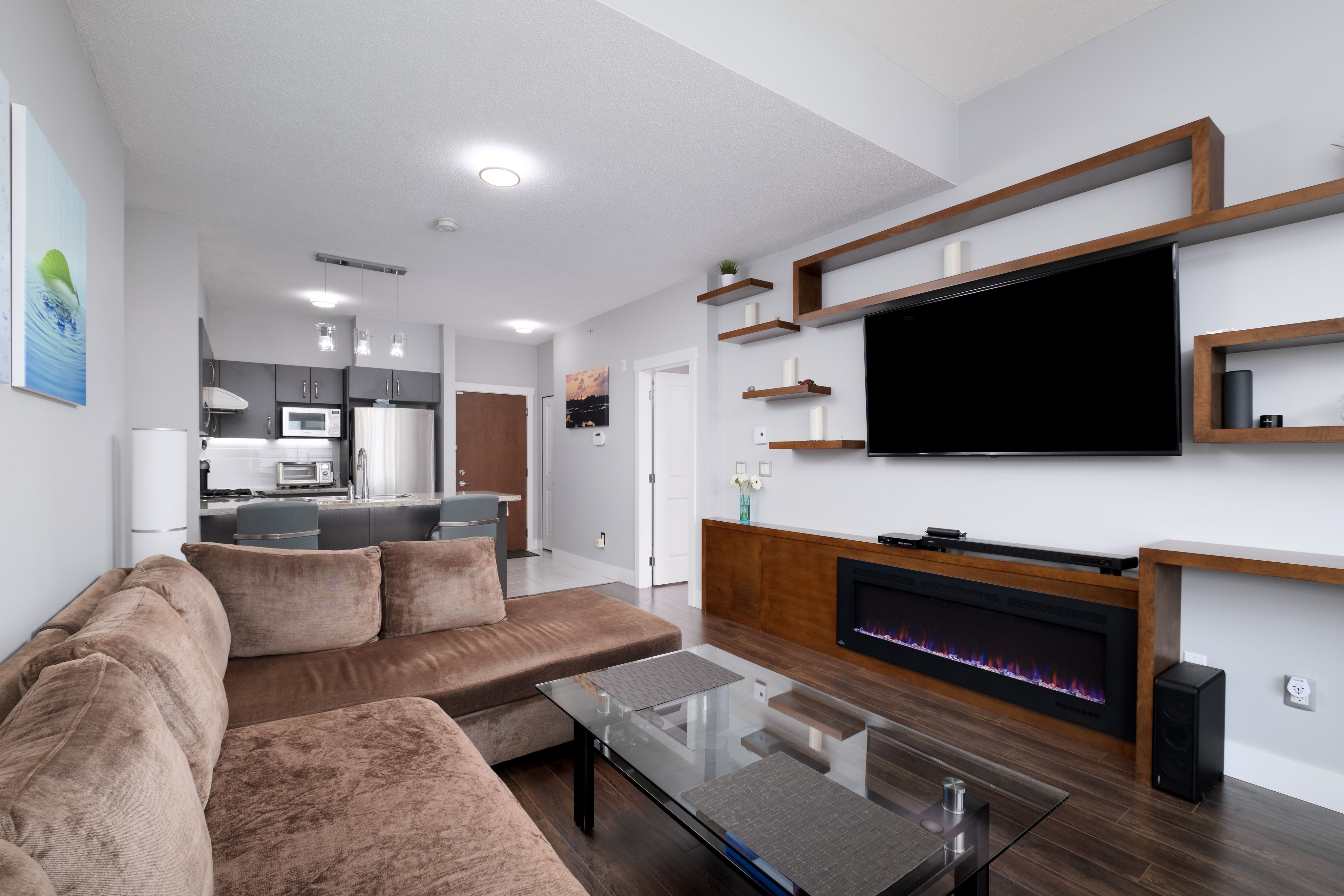 Better than New! TOP FLOOR 2 bedroom East facing unit with 2 Parking in Meridian Gate by Polygon. Lovingly cared for by one owner and features: 2 large bedrooms separated by living area for extra privacy. Master bedroom has a large walk-in closet and 5 piece modern ensuite. Living area updated with a electric fireplace feature wall with custom built in cabinetry, shelves and home entertainment system. Lighting updated to LED with fan/light in each bedroom. Newer fabric roller shades and black out fabrics in the bedrooms. Blomberg Washer and Dryer (2019) in separate laundry closet with extra room for linens and storage. New custom paint throughout (2018). Location:5 mins walking distance to Central plaza with Walmart,restaurants, shops etc Pets welcome, Rentals welcome (with restrictions)