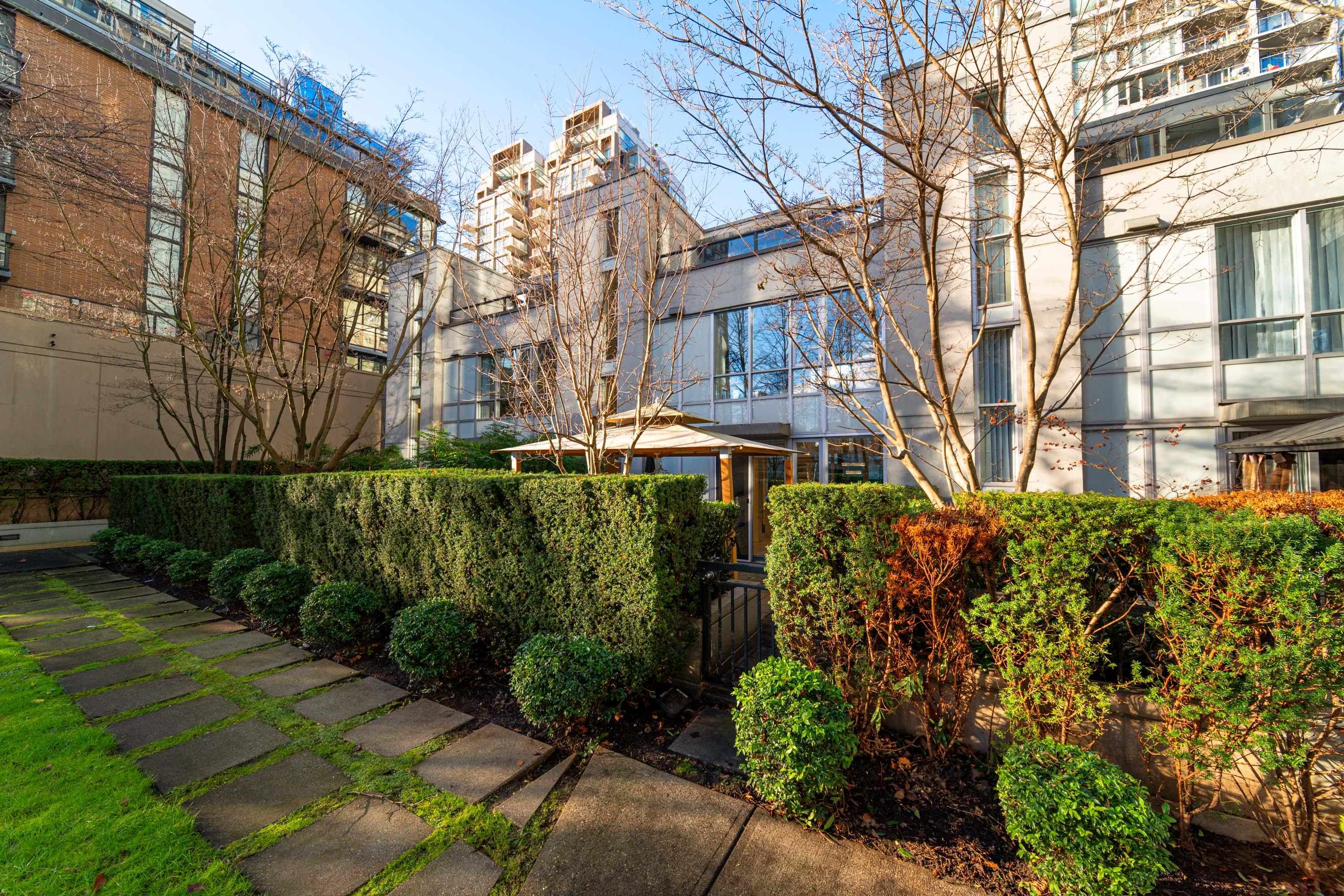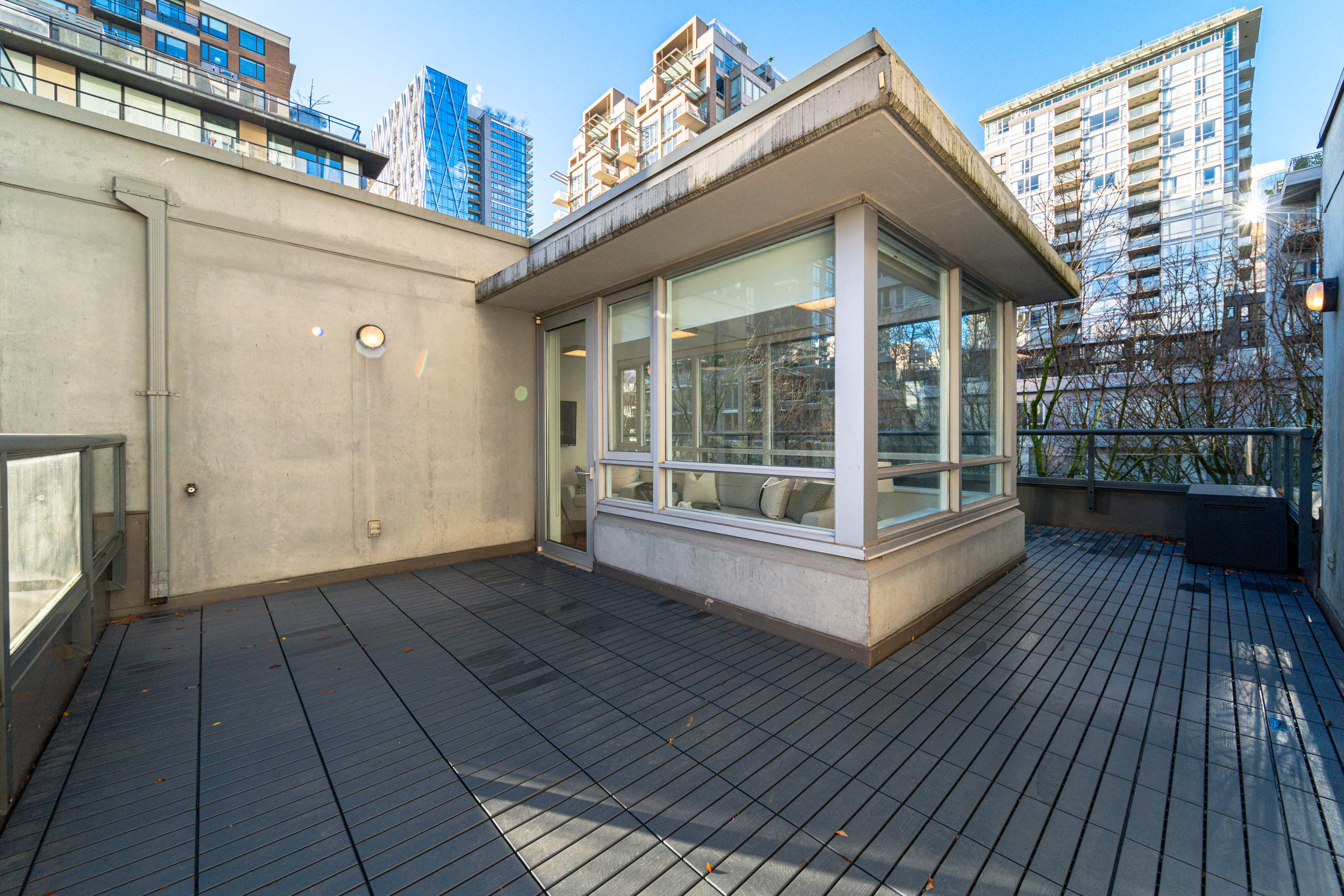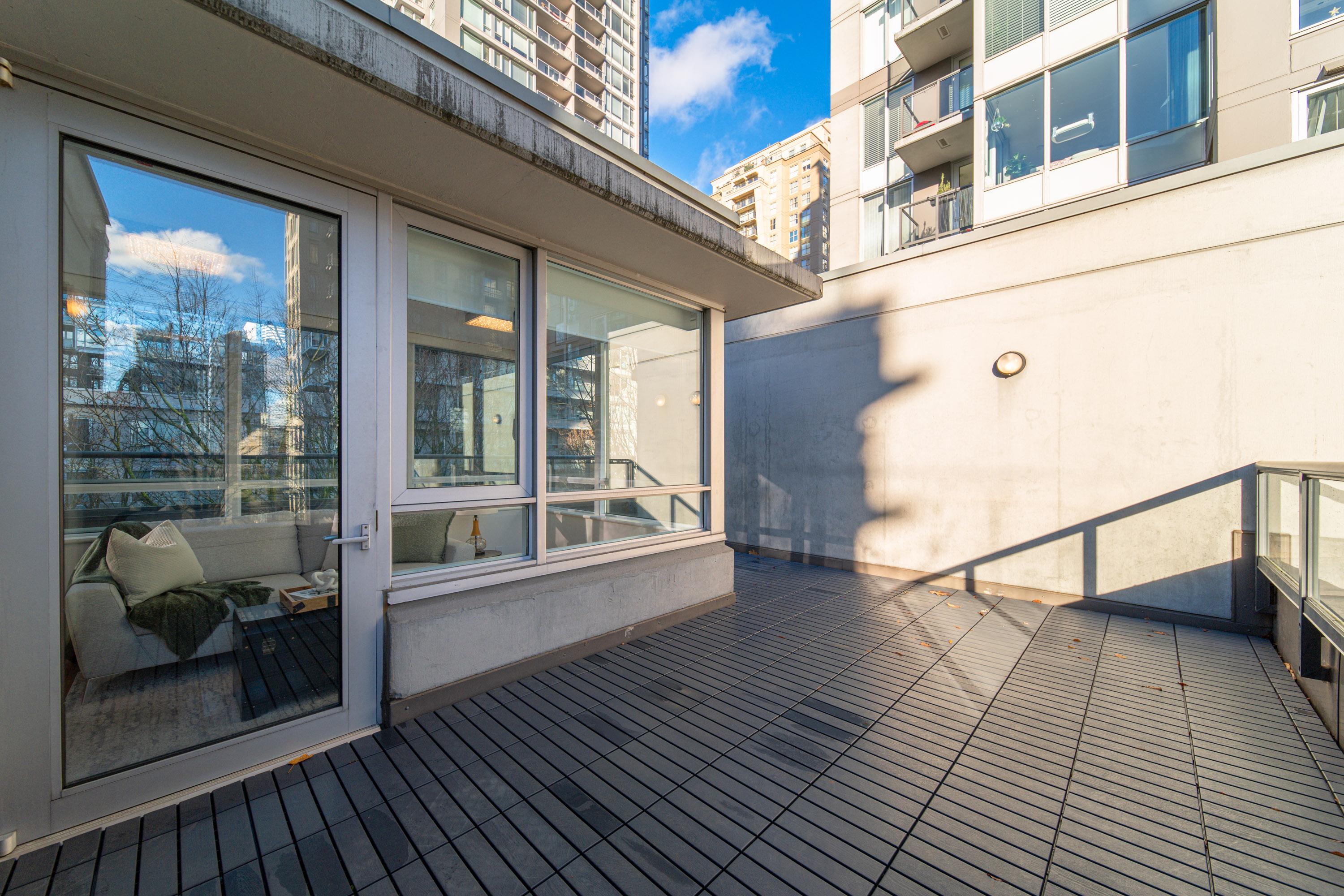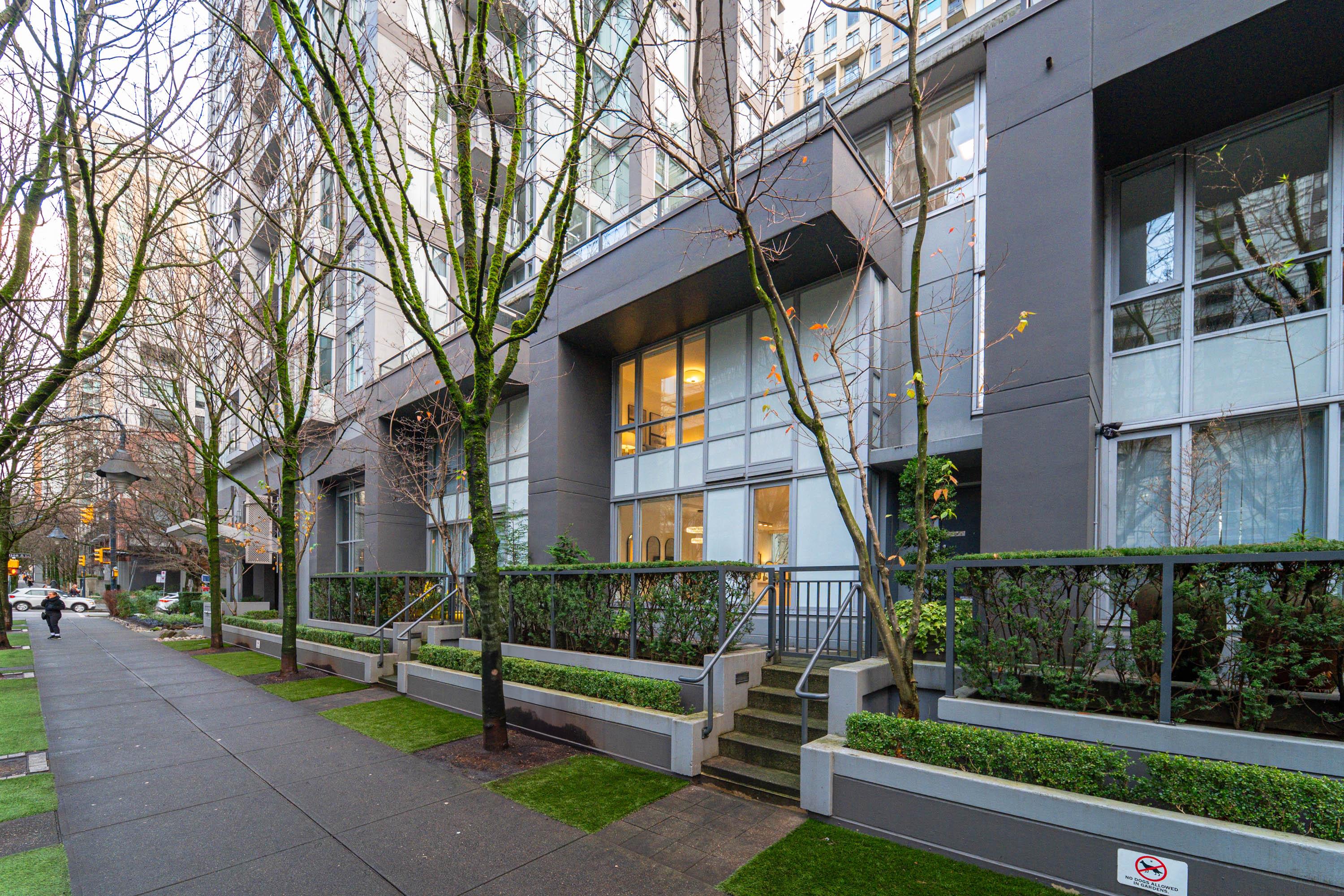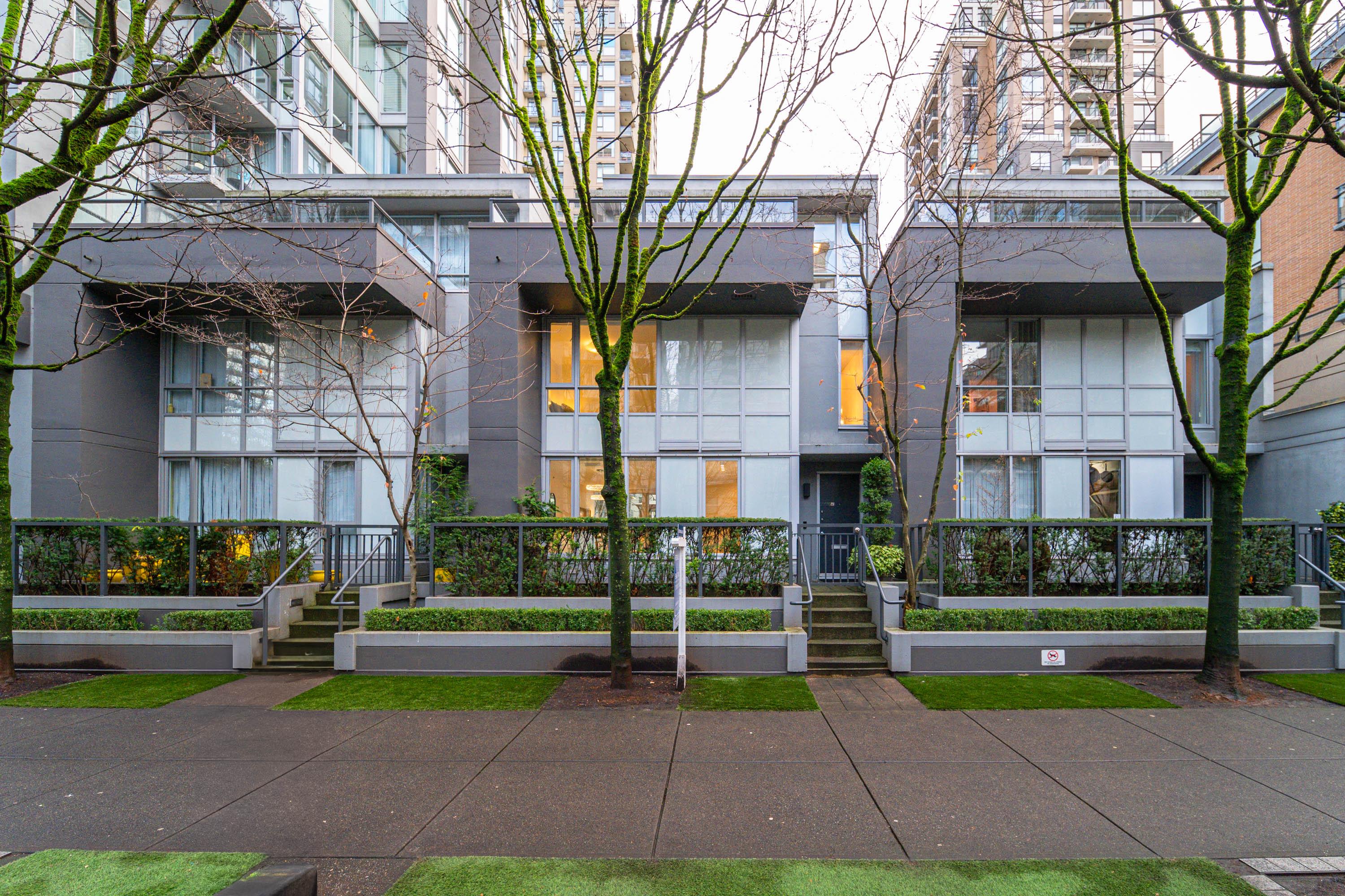 Modern Yaletown Living, Reimagined! This updated 3-level townhome combines sleek design with inviting warmth. Enjoy polished concrete floors on the main level, hardwood upstairs, and a spacious pantry/storage nook off the living room—perfect for organization or as a functional coffee bar. The open-concept living area flows to a large private patio, connecting to a serene courtyard and the building’s hot tub room. Upstairs, find 2 bright bedrooms and a stunning glass-encased 3rd level flex space with a wrap-around deck—ideal as an office, lounge, or 3rd bedroom. A true urban retreat steps from the seawall, dining, and shopping, Nesters Groceries, Choices Market, Shoppers Drug Mart, Rogers Arena & BC Place. 1 parking & storage included. School Catchment: Crosstown Elementary & King George Sec. Pets welcome (2 dogs or 2 cats), Rentals Welcome (No Short-term rentals)
