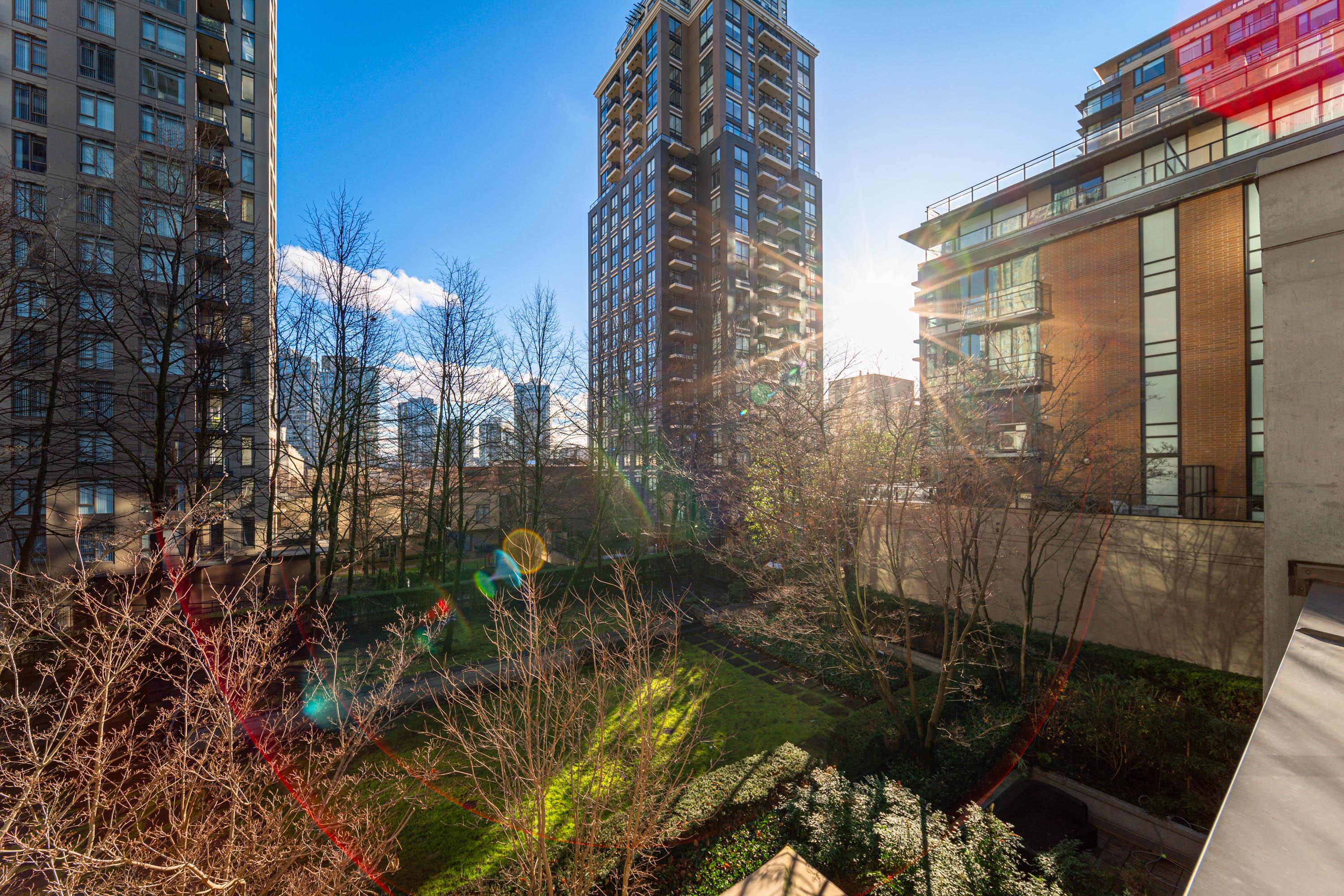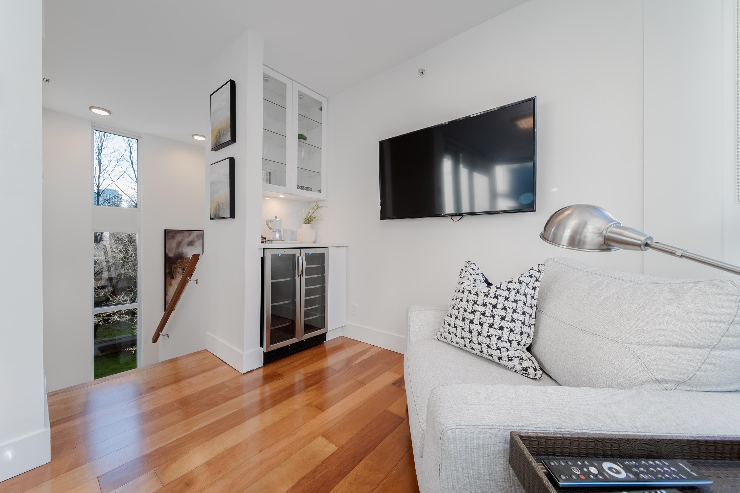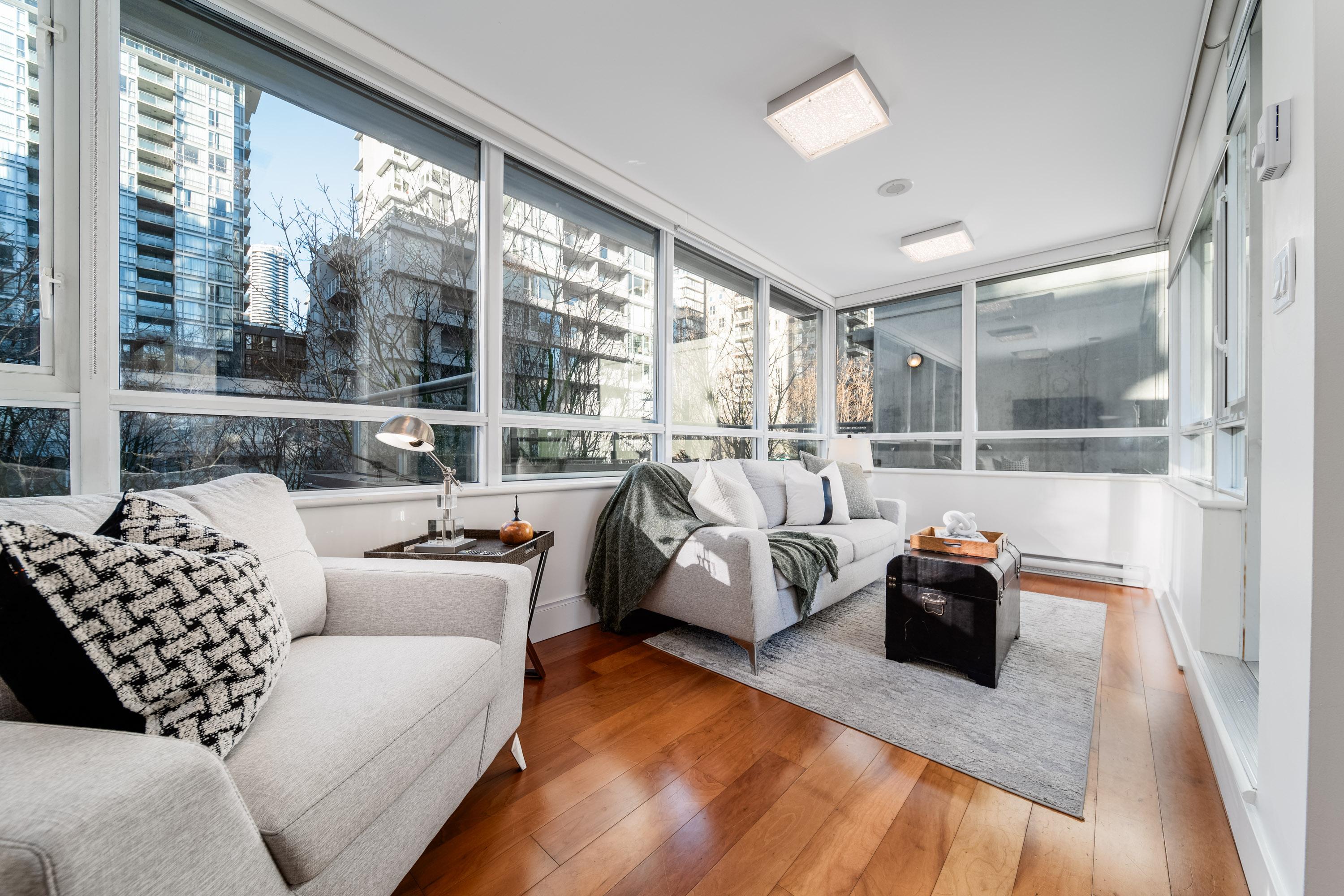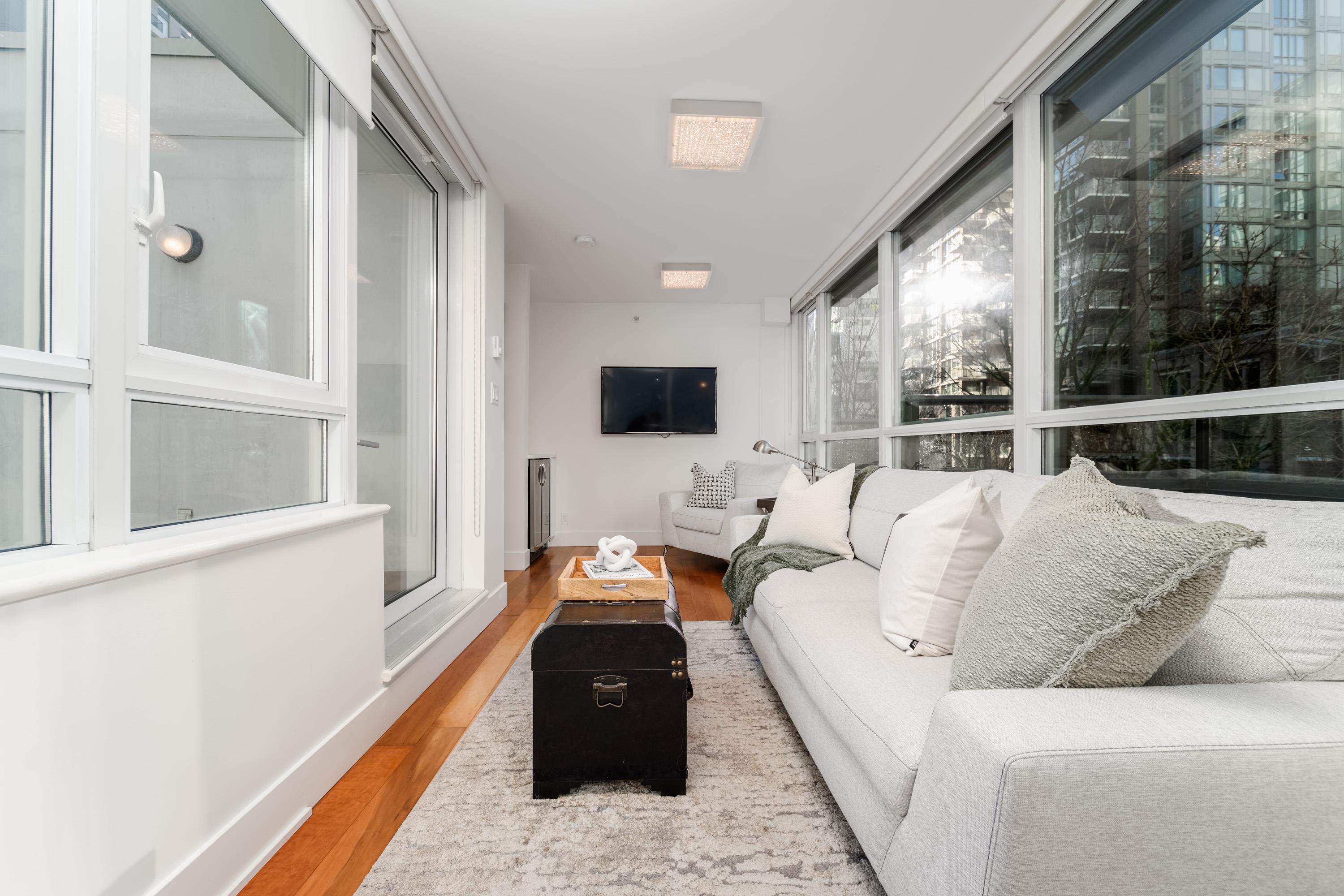 Modern Yaletown Living, Reimagined! This updated 3-level townhome combines sleek design with inviting warmth. Enjoy polished concrete floors on the main level, hardwood upstairs, and a spacious pantry/storage nook off the living room—perfect for organization or as a functional coffee bar. The open-concept living area flows to a large private patio, connecting to a serene courtyard and the building’s hot tub room. Upstairs, find 2 bright bedrooms and a stunning glass-encased 3rd level flex space with a wrap-around deck—ideal as an office, lounge, or 3rd bedroom. A true urban retreat steps from the seawall, dining, and shopping, Nesters Groceries, Choices Market, Shoppers Drug Mart, Rogers Arena & BC Place. 1 parking & storage included. School Catchment: Crosstown Elementary & King George Sec. Pets welcome (2 dogs or 2 cats), Rentals Welcome (No Short-term rentals)