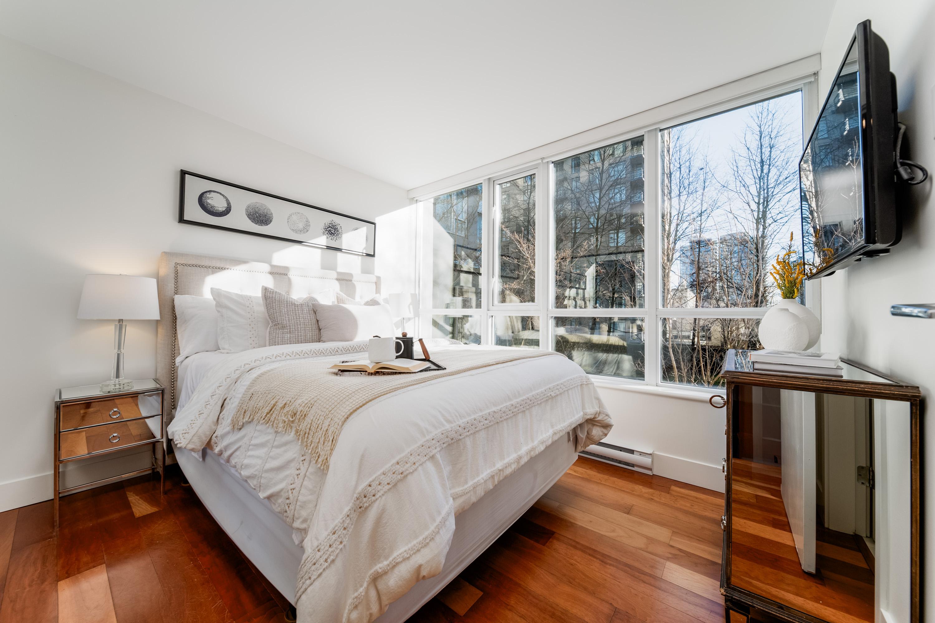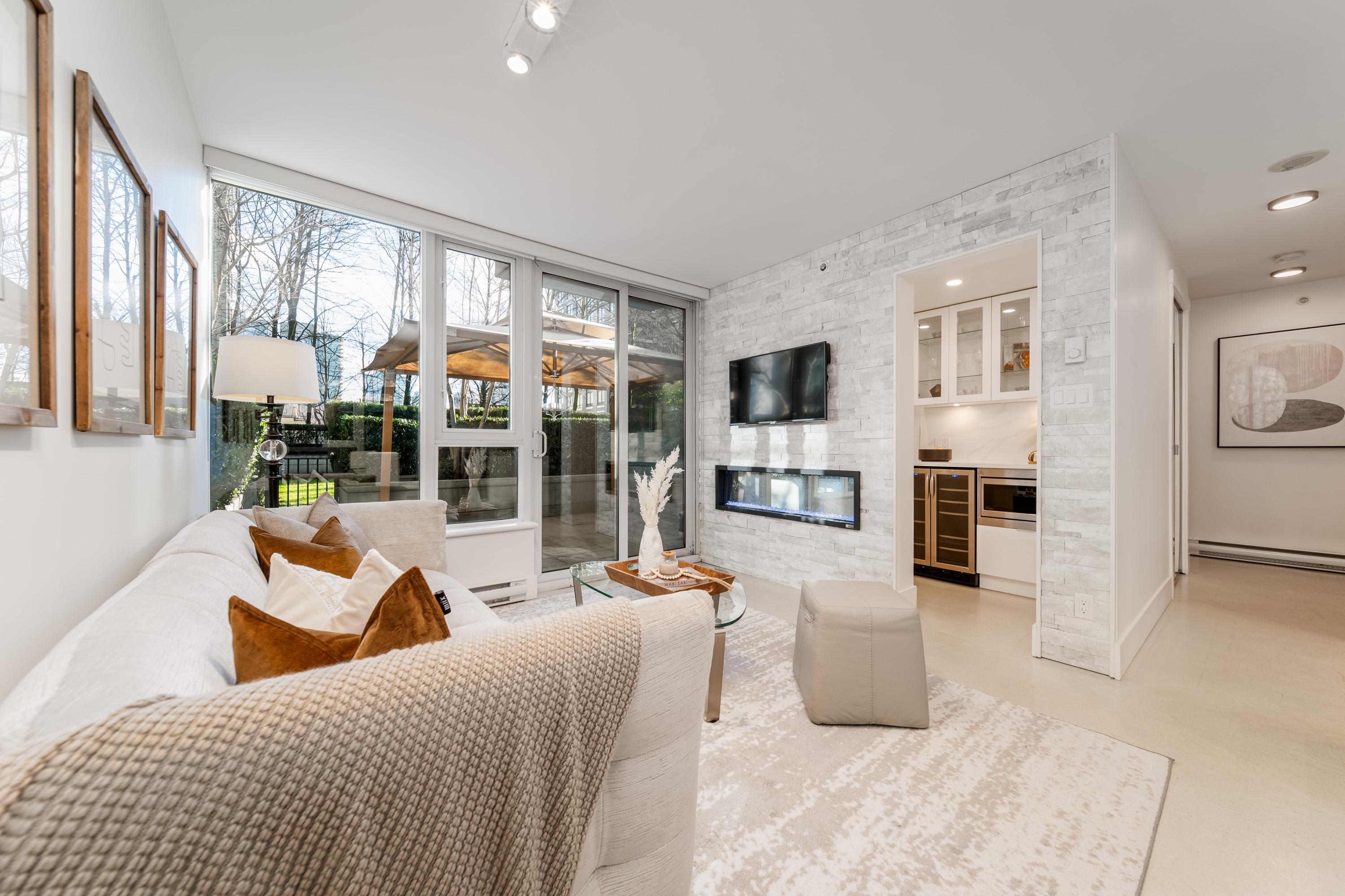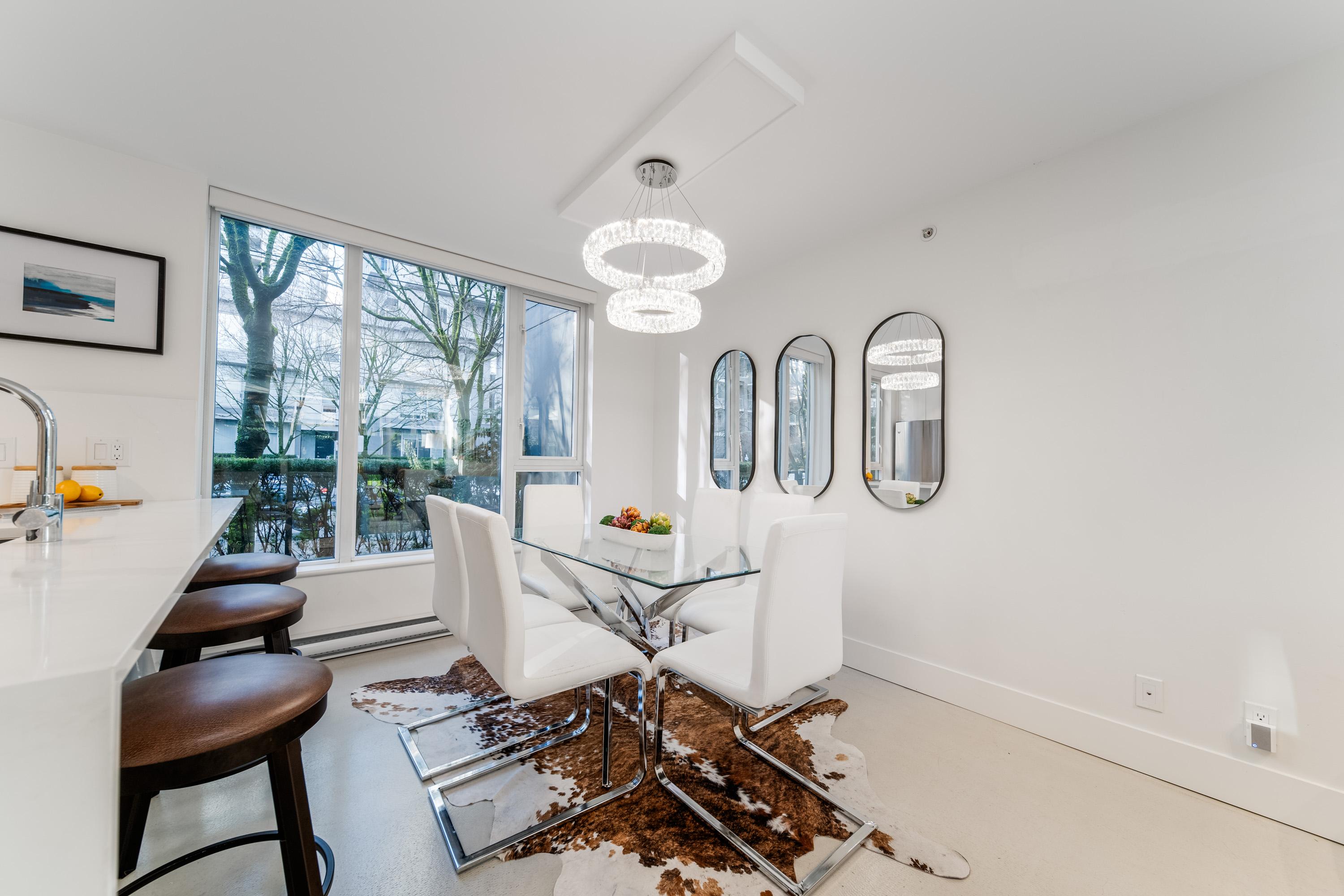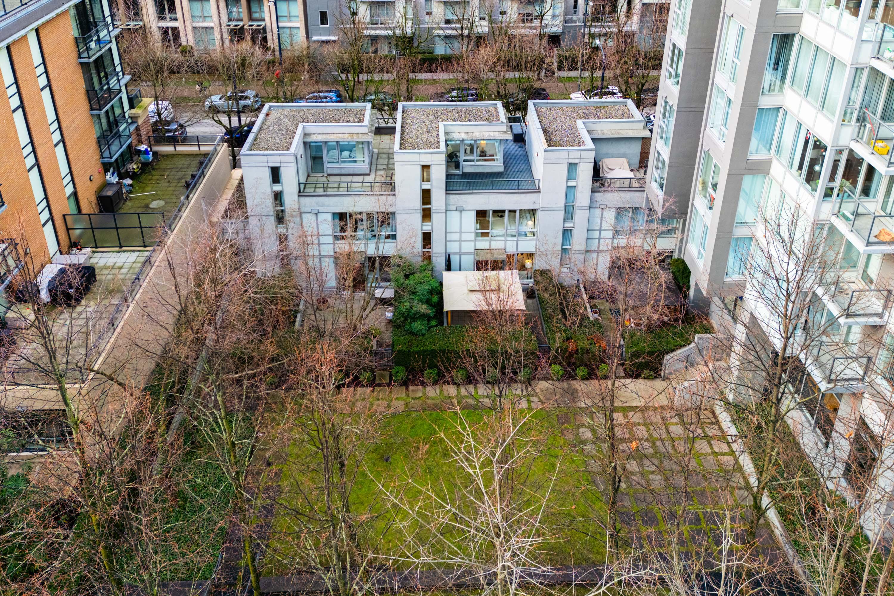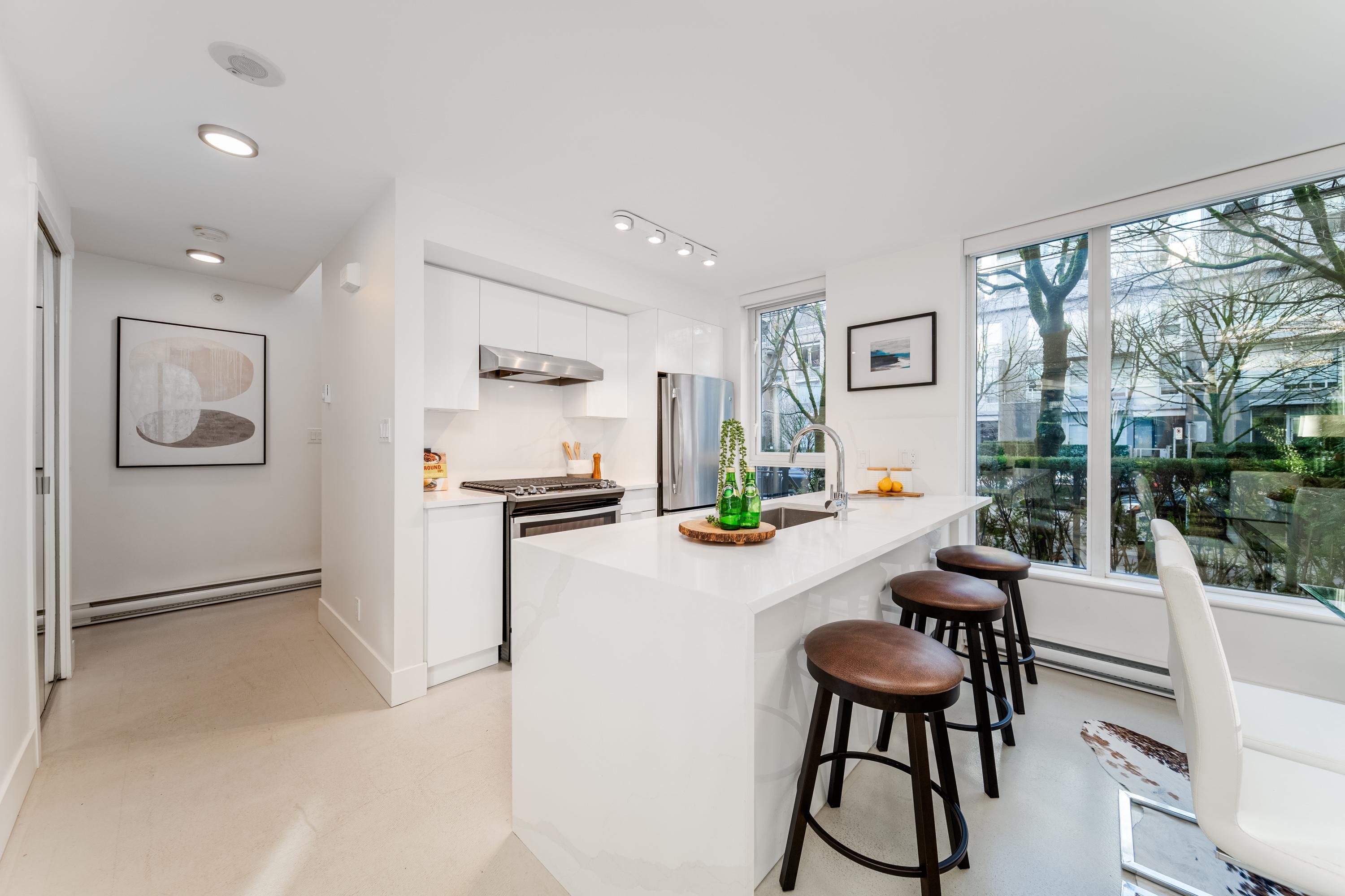 Modern Yaletown Living, Reimagined! This updated 3-level townhome combines sleek design with inviting warmth. Enjoy polished concrete floors on the main level, hardwood upstairs, and a spacious pantry/storage nook off the living room—perfect for organization or as a functional coffee bar. The open-concept living area flows to a large private patio, connecting to a serene courtyard and the building’s hot tub room. Upstairs, find 2 bright bedrooms and a stunning glass-encased 3rd level flex space with a wrap-around deck—ideal as an office, lounge, or 3rd bedroom. A true urban retreat steps from the seawall, dining, and shopping, Nesters Groceries, Choices Market, Shoppers Drug Mart, Rogers Arena & BC Place. 1 parking & storage included. School Catchment: Crosstown Elementary & King George Sec. Pets welcome (2 dogs or 2 cats), Rentals Welcome (No Short-term rentals)